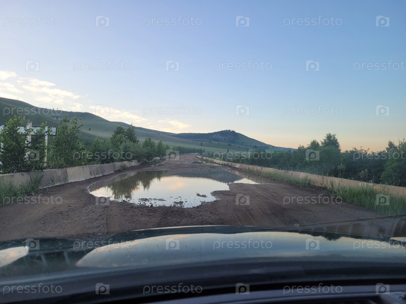 Лужа на дороге на фоне холмов и голубого неба в Забайкалье