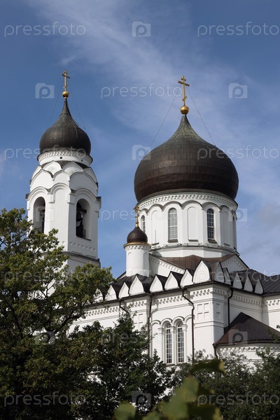 Здание, купола и кресты православного собора Архангела Михаила в городе Ломоносове (Ораниенбауме) летом на фоне голубого неба