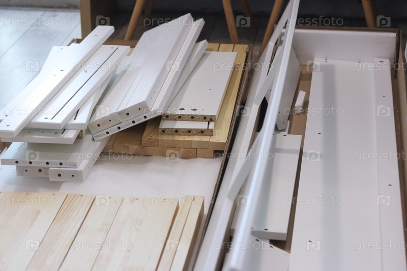 Деревянные панели для сборки пуфа лежат на полу. Косой угол