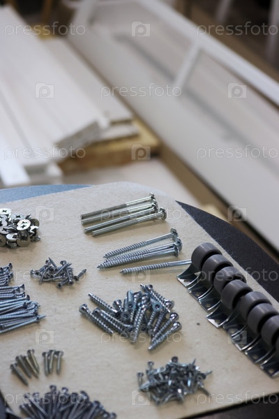 Мебельная фурнитура и комплектующие для сборки пуфа. Крупный план. Косой угол