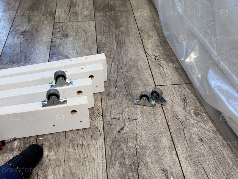 Деревянные панели с колесами. Отвертка рядом. Сборка пуфа. Подъем