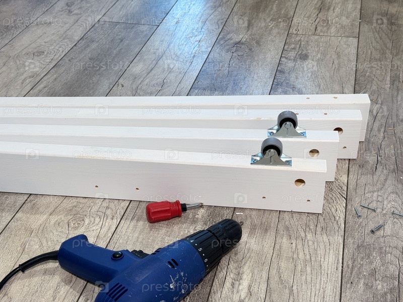 Деревянные панели с колесами. Отвертка рядом. Сборка пуфа