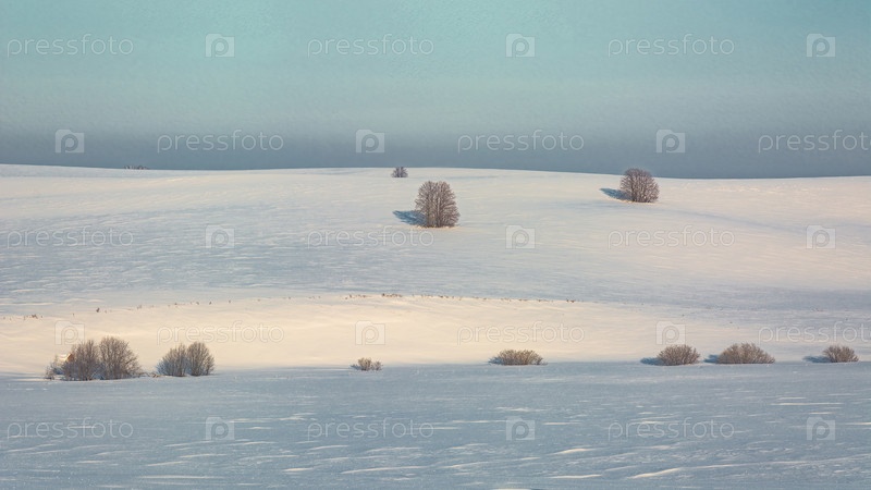 Пейзаж в стиле минимализма. Холмистый пейзаж, покрытый снегом. На переднем плане темные силуэты деревьев. Солнечный зимний день