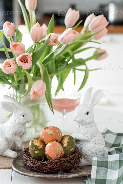 Букет нежных тюльпанов, пасхальные кролики и яйца с золотым узором на столе. На заднем плане белая кухня. Красивая поздравительная открытка. Концепция минимализма