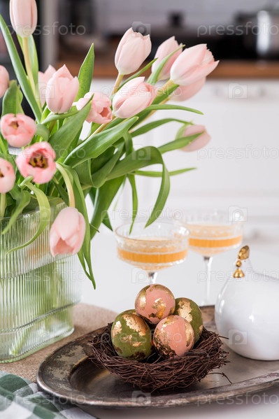 Букет нежных тюльпанов, пасхальный цыпленок и яйца с золотым узором на столе. На заднем плане изображена белая кухня. Красивая поздравительная открытка. Концепция минимализма