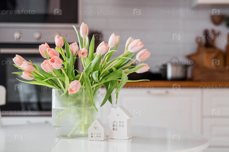 Весеннее время. Букет нежных тюльпанов и белые домики на столе. На заднем плане интерьер белой кухни. Концепция домашнего декора и уюта