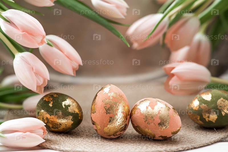 Концепция светлого праздника Пасхи. Нежные пасхальные яйца в розовых, золотых и зеленых тонах и нежные розовые тюльпаны