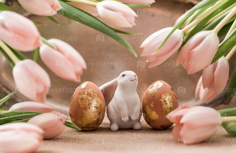 Концепция светлого праздника Пасхи. Нежные пасхальные яйца в розовых, золотых и зеленых тонах и нежные розовые тюльпаны