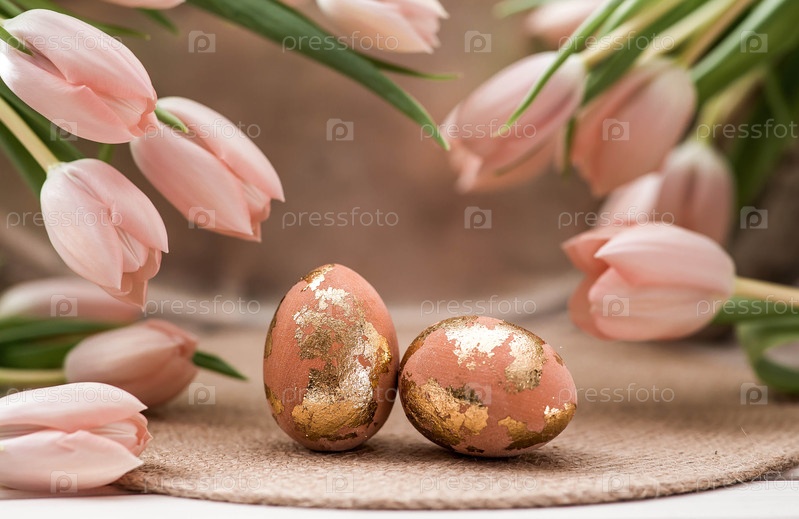 Концепция светлого праздника Пасхи. Нежные пасхальные яйца в розовых, золотых и зеленых тонах и нежные розовые тюльпаны