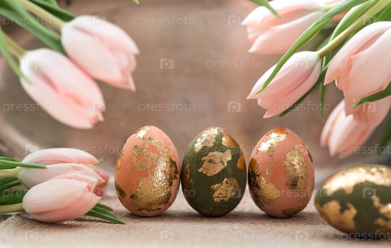 Концепция яркого праздника Пасхи. Нежные пасхальные яйца в розовых, золотых и зеленых тонах и нежные розовые тюльпаны