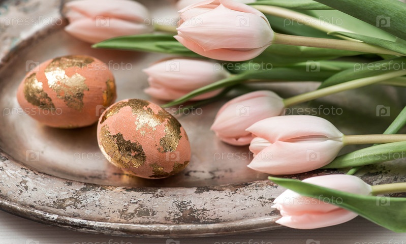Концепция светлого праздника Пасхи. Нежные пасхальные яйца в розовых, золотых и зеленых тонах и нежные розовые тюльпаны