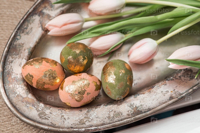 Концепция яркого праздника Пасхи. Нежные пасхальные яйца в розовых, золотых и зеленых тонах и нежные розовые тюльпаны