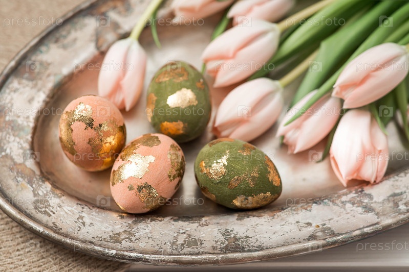 Концепция светлого праздника Пасхи. Нежные пасхальные яйца в розовых, золотых и зеленых тонах и нежные розовые тюльпаны