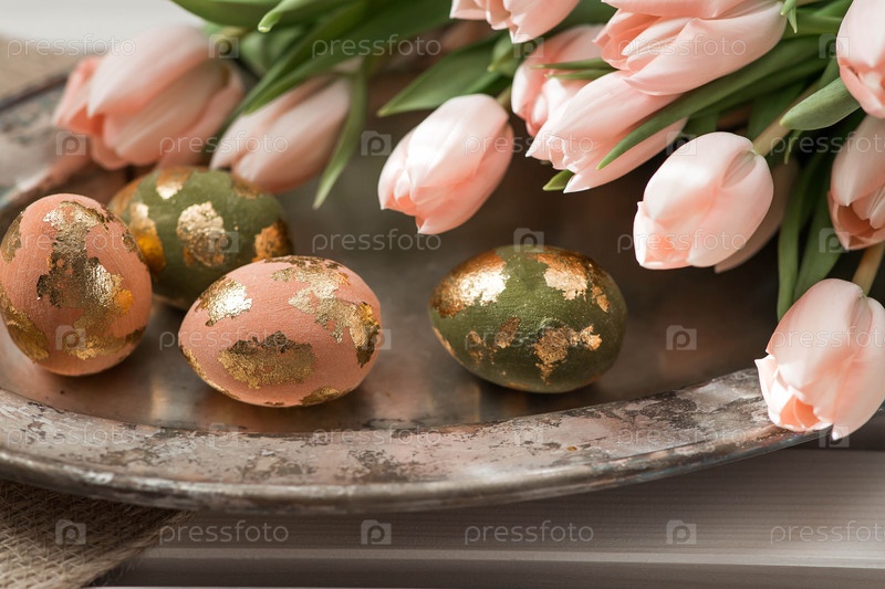 Концепция светлого праздника Пасхи. Нежные пасхальные яйца в розовых, золотых и зеленых тонах и нежные розовые тюльпаны