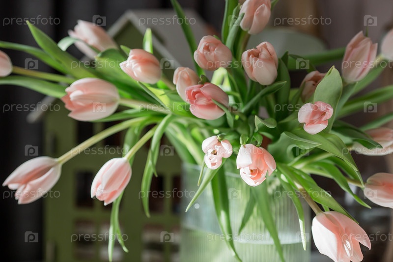 Букет нежно-розовых тюльпанов в красивой стильной вазе на столе. Концепция приурочена к наступлению весны и Международному женскому дню 8 марта