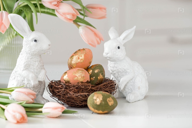 Букет нежных тюльпанов, пасхальные кролики и яйца с золотым узором на столе. На заднем плане белая кухня. Красивая поздравительная открытка. Концепция минимализма
