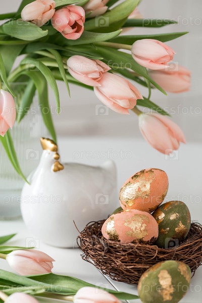 Букет нежных тюльпанов, пасхальный цыпленок и яйца с золотым узором на столе. На заднем плане изображена белая кухня. Красивая поздравительная открытка. Концепция минимализма