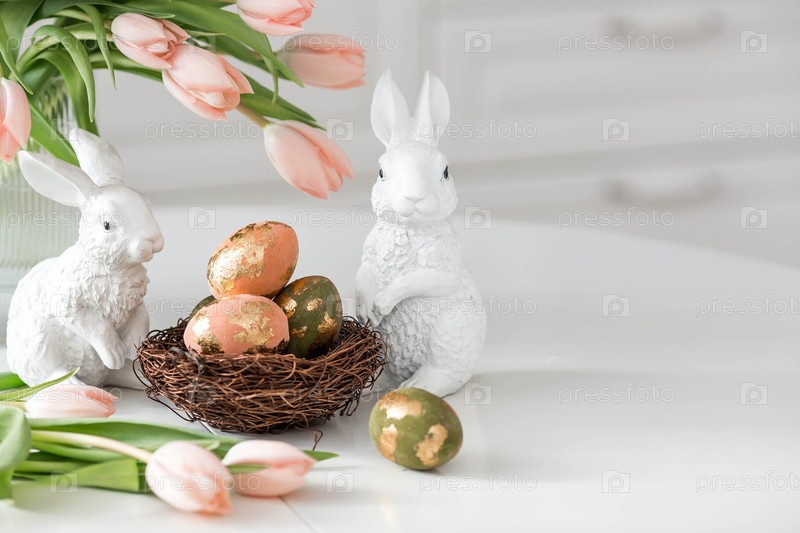 Букет нежных тюльпанов, пасхальные кролики и яйца с золотым узором на столе. На заднем плане белая кухня. Красивая поздравительная открытка. Концепция минимализма