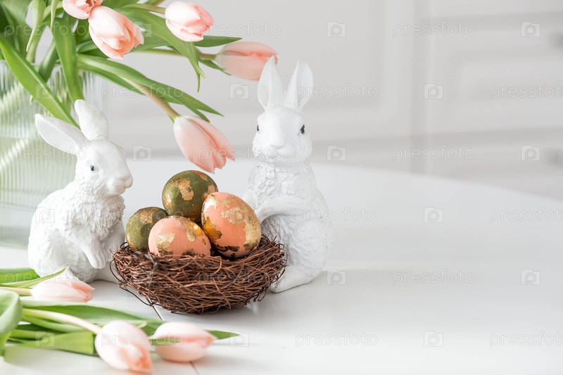 Букет нежных тюльпанов, пасхальные кролики и яйца с золотым узором на столе. На заднем плане белая кухня. Красивая поздравительная открытка. Концепция минимализма