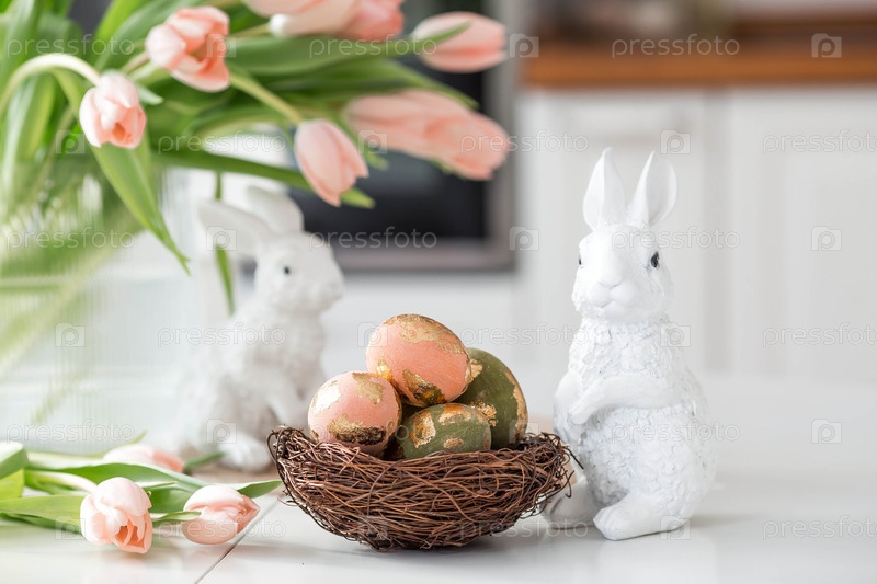 Букет нежных тюльпанов, пасхальные кролики и яйца с золотым узором на столе. На заднем плане белая кухня. Красивая поздравительная открытка. Концепция минимализма