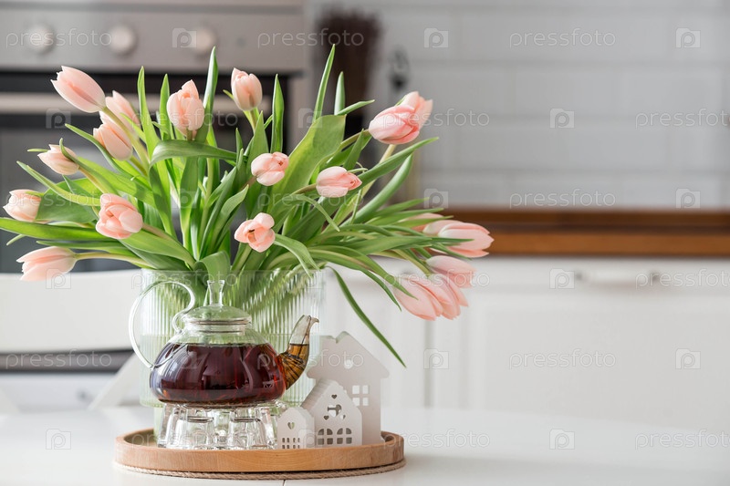 Весеннее время. Букет нежных тюльпанов и чайник на столе. На заднем плане интерьер белой кухни. Концепция домашнего декора и уюта