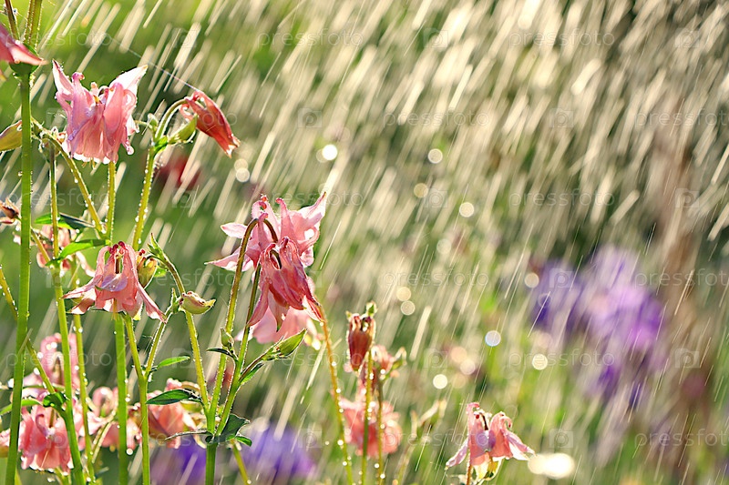 Баннер для экрана с цветами водосбора под дождем. Абстрактный цветочный весенний расфокусированный фон в пастельных тонах с мягким фокусом и боке, красивая яркая поздравительная открытка, приглашение, сезонная концепция