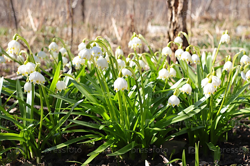 Нежные дикие цветы подснежника в весеннем лесу или саду. Концепция прихода весны и красивая цветочная поздравительная открытка. Абстрактный цветочный фон, баннер для экрана или шаблон для дизайна, выборочный фокус