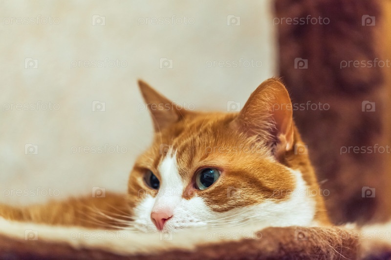 Ленивый рыжий кот лежит в кошачьем домике