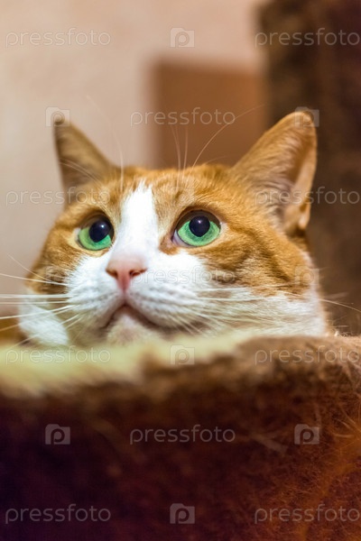 Ленивый рыжий кот лежит в кошачьем домике