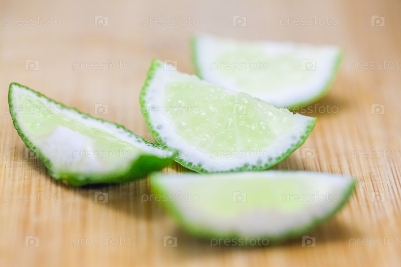 Ломтики лайма на деревянном столе, крупный план размытого фона