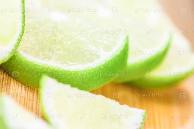 Ломтики лайма на деревянном столе, крупный план размытого фона