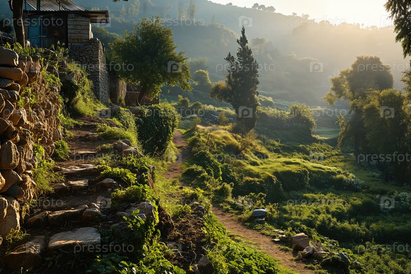 Тропа с каменной лестницей в лесистой долине