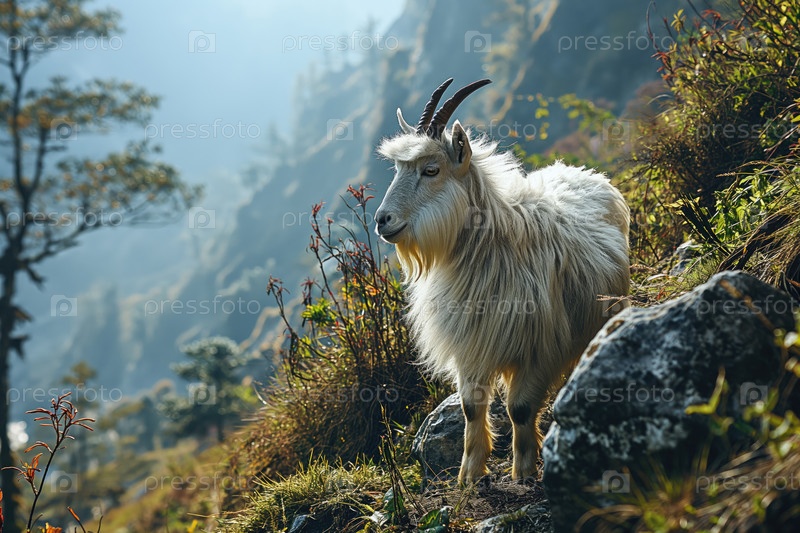 Домашняя коза в естественном ландшафте горной долины