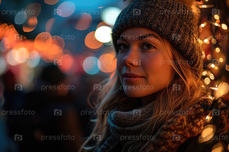 Портрет молодой женщины на улице в зимнем городе на фоне рождественской елки со светящейся гирляндой
