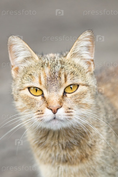 Серый полосатый кот гуляет на поводке по зеленой траве на улице