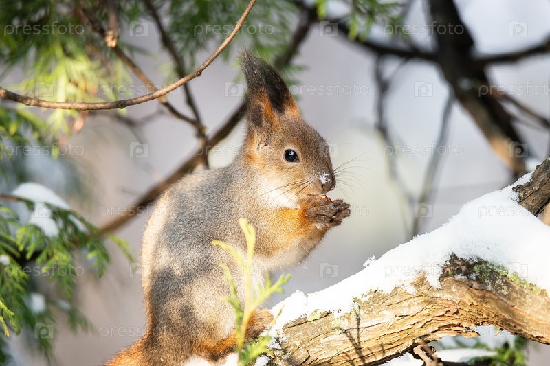 Белка зимой сидит на дереве