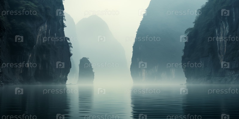 Тропическое побережье со скалистыми утесами в утреннем тумане