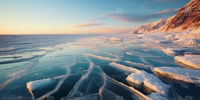 Зимний вид на большое замерзшее озеро с гористым побережьем