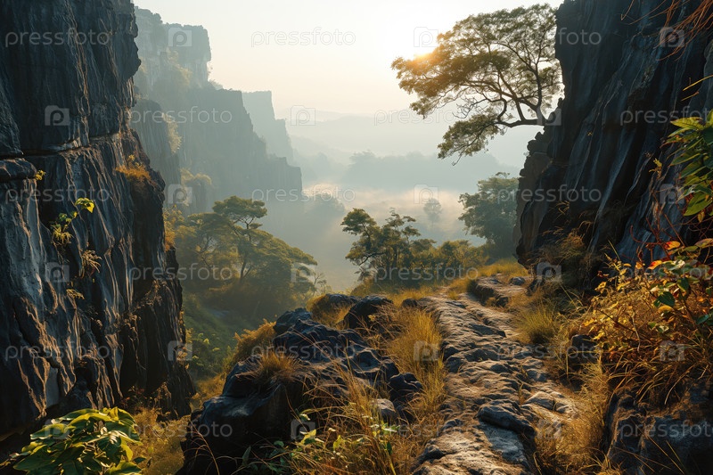 Тропа в горной местности с видом на красивую туманную долину в утренних лучах