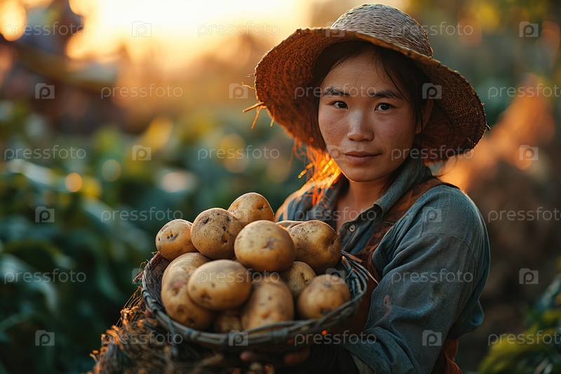 Женщина-фермер с собранным картофелем