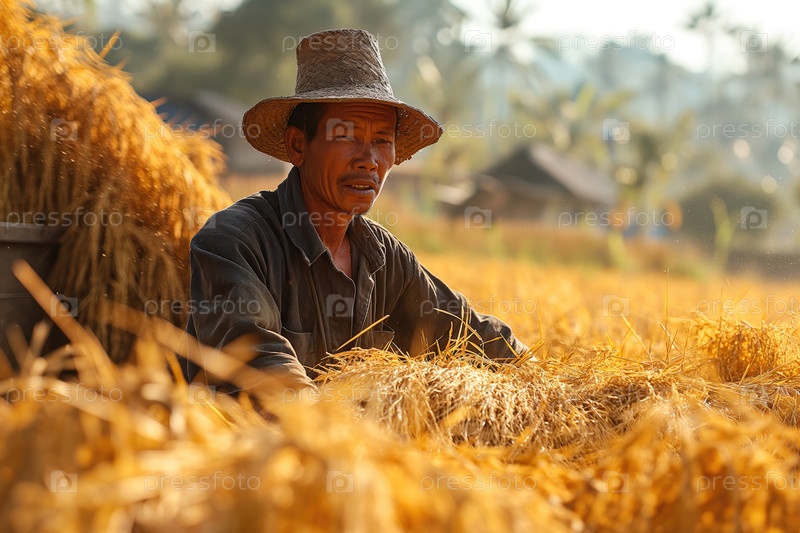 Азиатский фермер на поле среди соломы во время обмолота