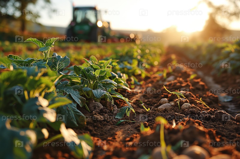 Клубни картофеля в борозде на поле после прохода картофелекопателя во время уборки урожая