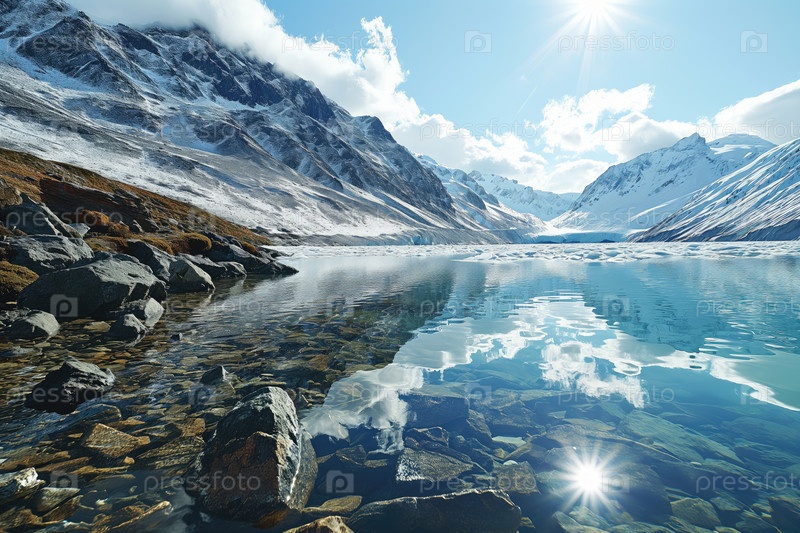 Чистейшее высокогорное озеро с прозрачной пресной водой между заснеженными горными хребтами