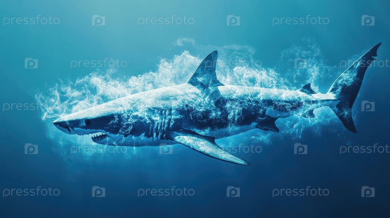Свирепая акула плывет по ярко-голубой воде, окруженная мерцающими пузырьками и освещенная естественным светом океана
