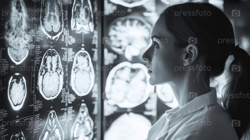 Профиль женщины, объединенный с МРТ-снимками мозга в двойной экспозиции