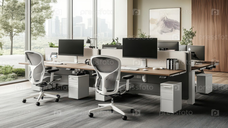 Светлое и современное офисное пространство с минималистичными белыми столами, эргономичными креслами и большими окнами с естественным освещением, создающими чистую и продуктивную рабочую среду