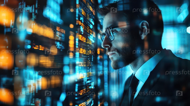 Бизнесмен в костюме стоит в современном центре обработки данных, окруженный светящимися цифровыми потоками данных и серверами