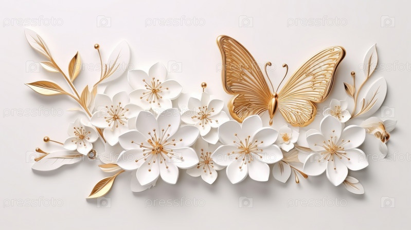 Ветка белого растения с весенними цветами и золотыми бабочками для легкого, светлого фона