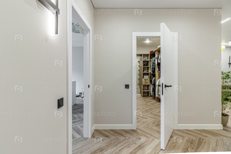 Дверь современной квартиры с белыми стенами и паркетным полом