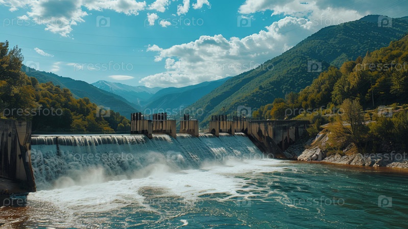 Плотина гидроэлектростанции с горами и рекой
